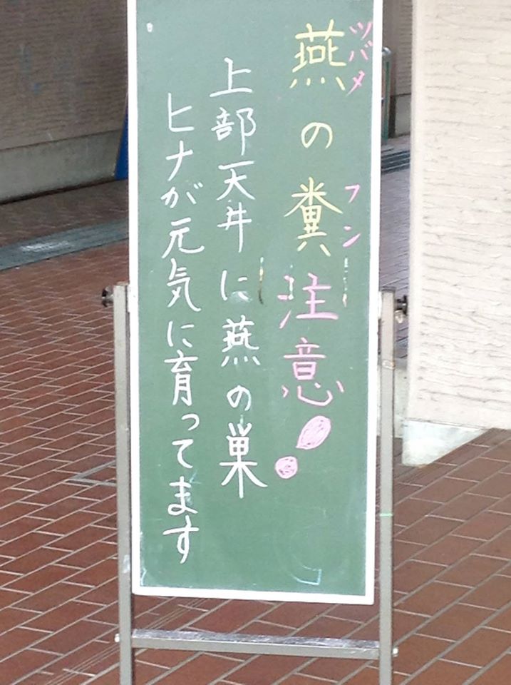 近所に用事で出掛けると、「燕の糞注意」の案内が。