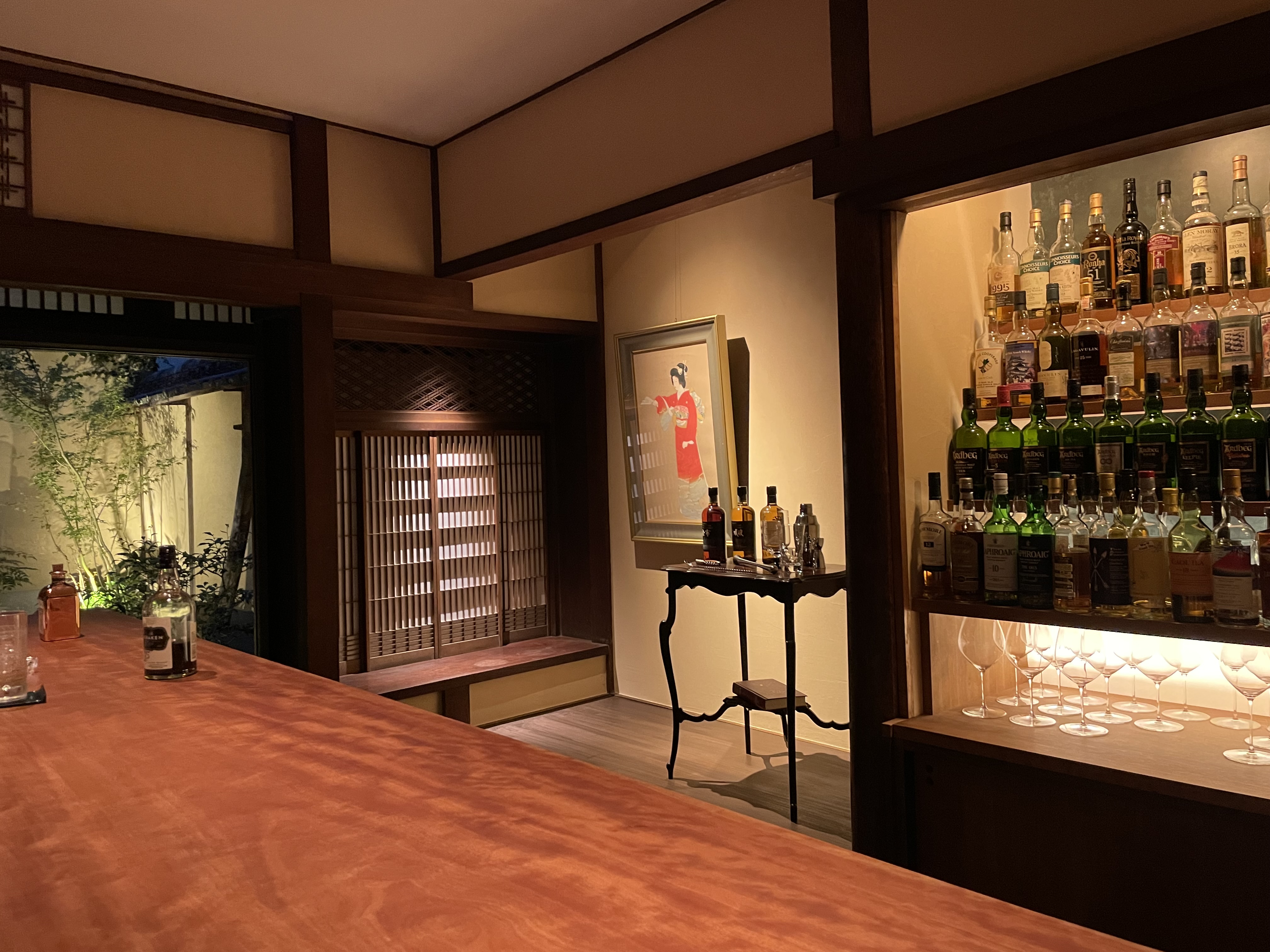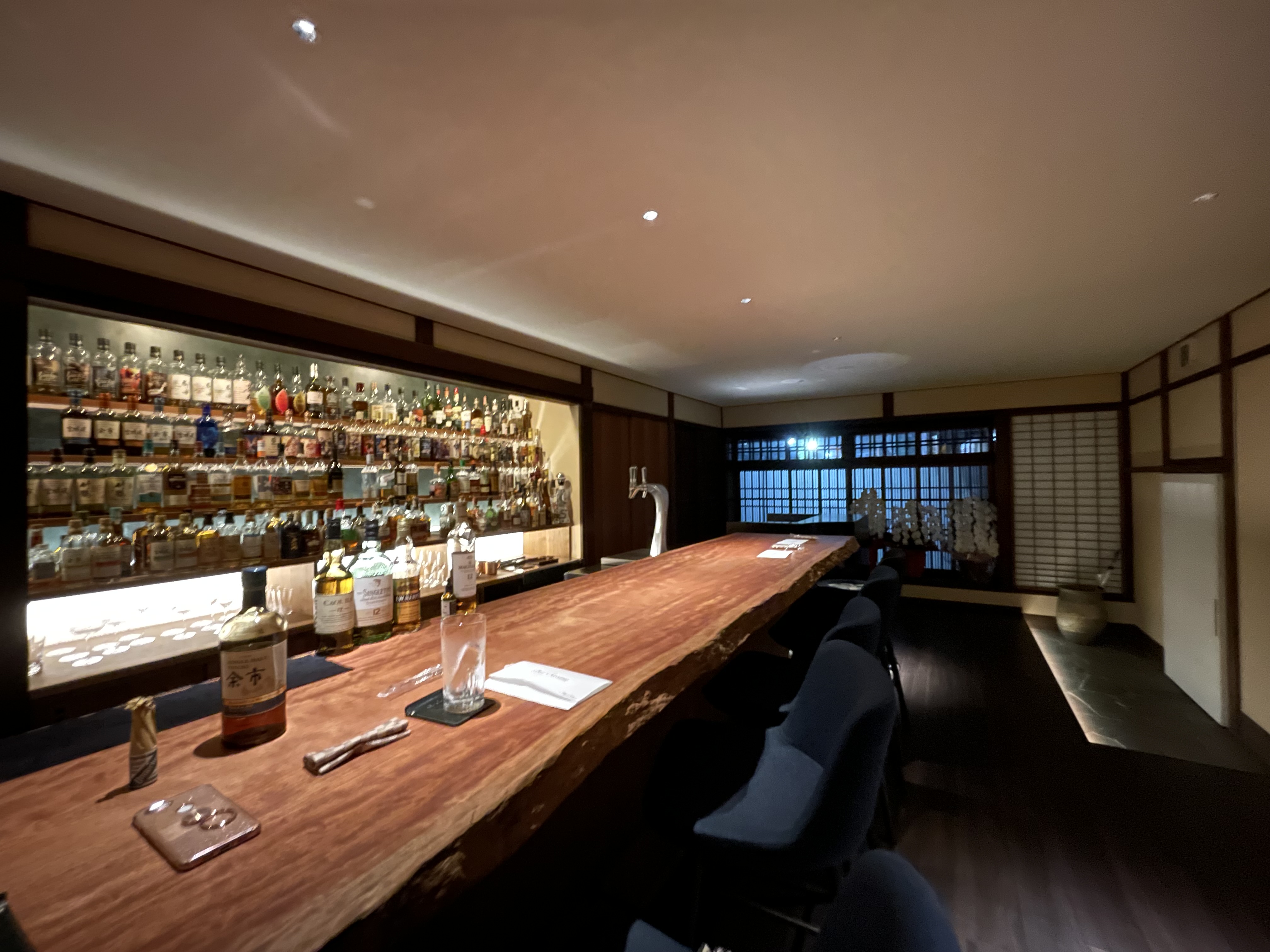扉を開けてもすぐには店内は見えず、更に障子を開けると、目の前にBarカウンターが現れるという、入店時からドキドキワクワクするお店✨